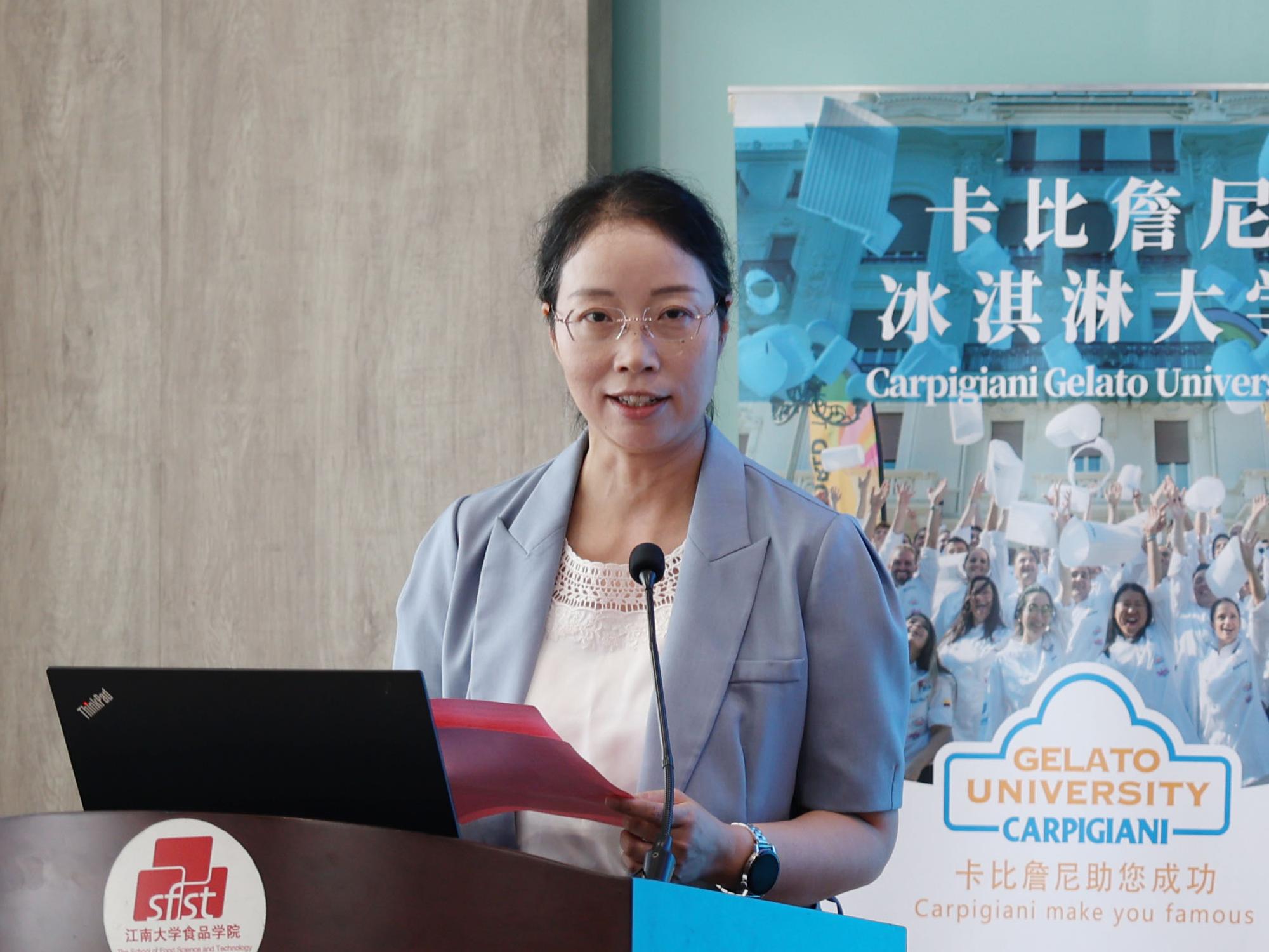 傅莉莉代表学院致辞。她对出席“一带一路”国际大学生意式手工冰淇淋体验日的嘉宾和师生表示热烈欢迎,强调本次活动在促进校企合作、跨文化交流、创新人才培养等方面的重要意义。她期待参与者通过这一“甜蜜之旅”充分感受冰淇淋制作工艺,收获知识与友谊。