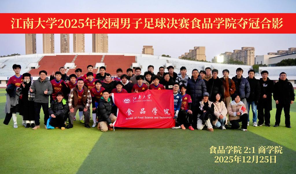 12月25日,2025年江南大学校园男子足球比赛(校长杯)大学院组决赛在江南大学体育中心举行,食品学院足球队以顽强的意志、精湛的技艺与默契的团队配合,历经鏖战,最终以2:1的比分战胜强劲对手,勇夺冠军!队员们用汗水与激情,展现食品学子团结拼搏、永不放弃的体育精神。这也是食品学院继2022年“校长杯”夺冠后,再次问鼎巅峰!